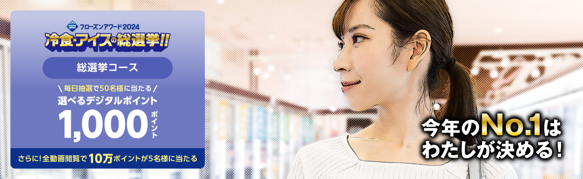 - ●当選結果は、マイページの「フローズンアワード投票結果と当選履歴」でご確認いただけます。 マイページはこちら ●「【その場で当たる】選べるデジタルポイント(マルチバリューコード)1,000ポイント」は、当選者様へLINEのメッセージにてポイント交換用のURLを送付させていただきます。10月31日までの当選者様には11月上旬に、11月30日までの当選者様には12月上旬にLINEのメッセージにてご連絡させていただく予定ですので、ブロックされている方はあらかじめブロックの解除をお願いします。 ●「【コンプリート賞】選べるデジタルポイント(マルチバリューコード)10万ポイント」の当選者様へのご連絡は2024年12月中旬以降を予定しています。 ●賞品発送時期については、諸事情により多少遅れる場合もございますが、予めご了承下さい。